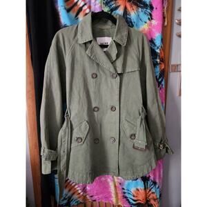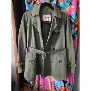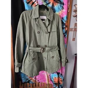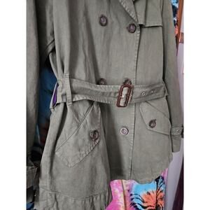 This Italian designer jacket is a rare find for any fashion enthusiast. The stunning olive green color, rainbow colored belt, and unique design make it a must-have for any woman's wardrobe. With a tag of Womens Italian Size Tagila 44, which is equal to US Womens Med or size 8, this jacket is perfect for those who appreciate high-quality, designer pieces.