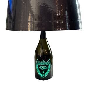 Upcycled Dom Perignon lamp. Perfect for a home bar, nightstands, end tables, or walkin closet. Multiple available for matching decor. You're sure to get compliments from your friends and family with this one of a kind Dom Perignon lamp. Takes a standard light bulb and plugs into a standard 110/120v outlet. The label illuminates green via push button under the bottle and is powered with batteries. The lamp will ship ground and will be carefully packed and bubble wrapped to ensure safe arrival. This listing is for lamp (bottle and lighting fixture) only, bulb and shade are not included.