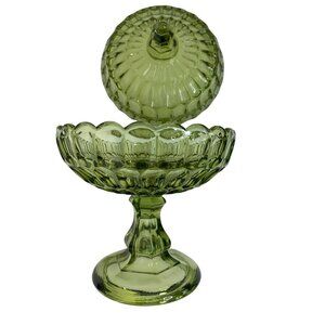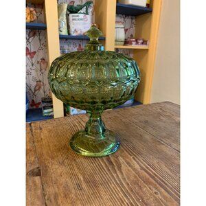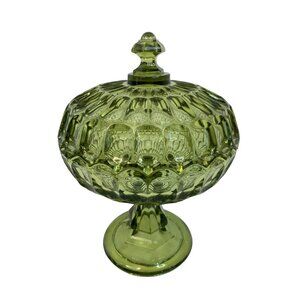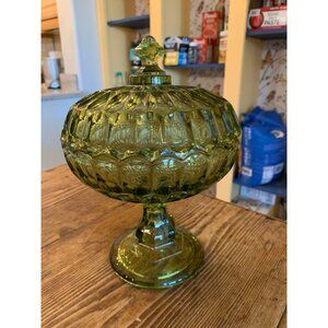 Rare Large Vintage 60s Green Fenton Glass Dish Pedestal Facet Covered 6975