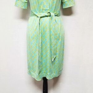 Rare Lilly Pulitzer Stretchy Silk Green Blue Houndstooth V-neck Belted Dress.