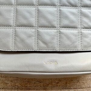 Rare find. Lovely Lodis quilted front leather Kinsley Flap bag is pretty light gray/cream leather.