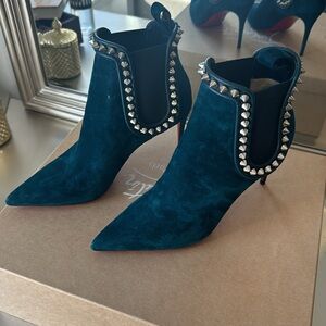 Elevate your style with these chic studded teal ankle boots. Perfect for adding a bold touch to any outfit.
