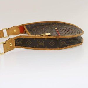 This chic satchel-style bag is crafted of classic monogram toile canvas with perforations throughout both sides which allows the beautiful Alcantara lining color to be visible. The bag also features vachetta cowhide trim, an exterior pocket on the front, an adjustable shoulder strap with an orange underside, and a crossover strap with a beautiful decorative lock detail to assist in closing. The padlock lifts up to release the flap which opens to an orange microfiber lining with a patch pocket. This is an excellent shoulder bag for day or evening wear.