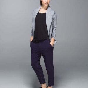 The Lululemon Exquisite Trouser Crop in Shine Dot Black Grape is a stylish and versatile activewear pant designed for women in size 8. Made from a blended fabric, these tapered-leg pants feature a cropped style with a 24-inch inseam, making them perfect for various activities like yoga, crossfit, or beach workouts. The purple color adds a pop of vibrancy to your activewear collection, while the regular fit ensures comfort and flexibility during your workout. Perfect for all seasons, these pants are a must-have for any active woman's wardrobe.