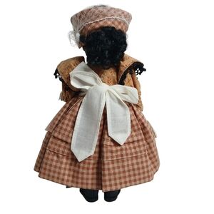 Description: Prissy is dressed in a rust plaid and print long dress