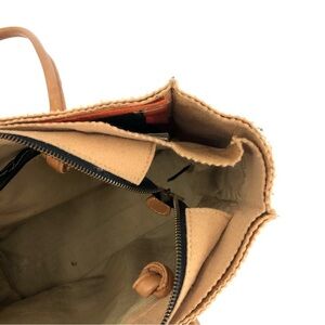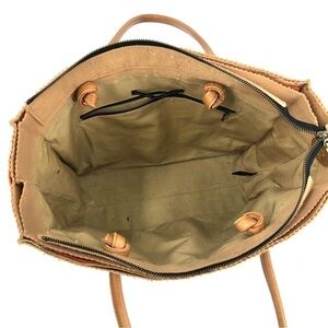 Large sturdy zipper on top with an attached logo gold tone zipper pull.