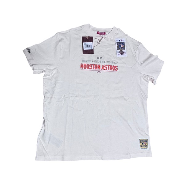 Mitchell and Ness Houston Astros 2017 World Series Champions t-shirt. This short-sleeve tee displays the team's victory prominently on the front. The back of the shirt features "Houston Texas 2017 World Series Champions Houston Astros" text.