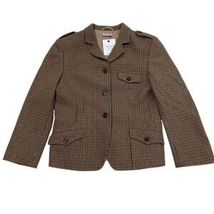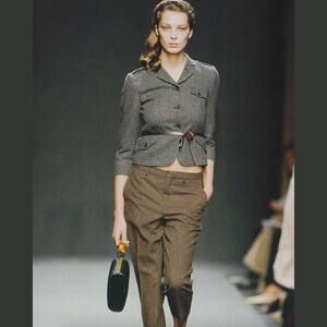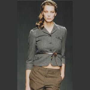 Own a piece of fashion history with this authentic Miu Miu Fall 2003 runway blazer, a highly collectible equestrian-inspired jacket from Miuccia Prada’s acclaimed Ready-to-Wear collection. Crafted in Italy from a luxurious blend of 75% wool, 20% nylon, and 5% cashmere, this tailored piece features a rich houndstooth pattern, epaulet shoulders, and sharply structured lines that defined the early Y2K Miu Miu silhouette.