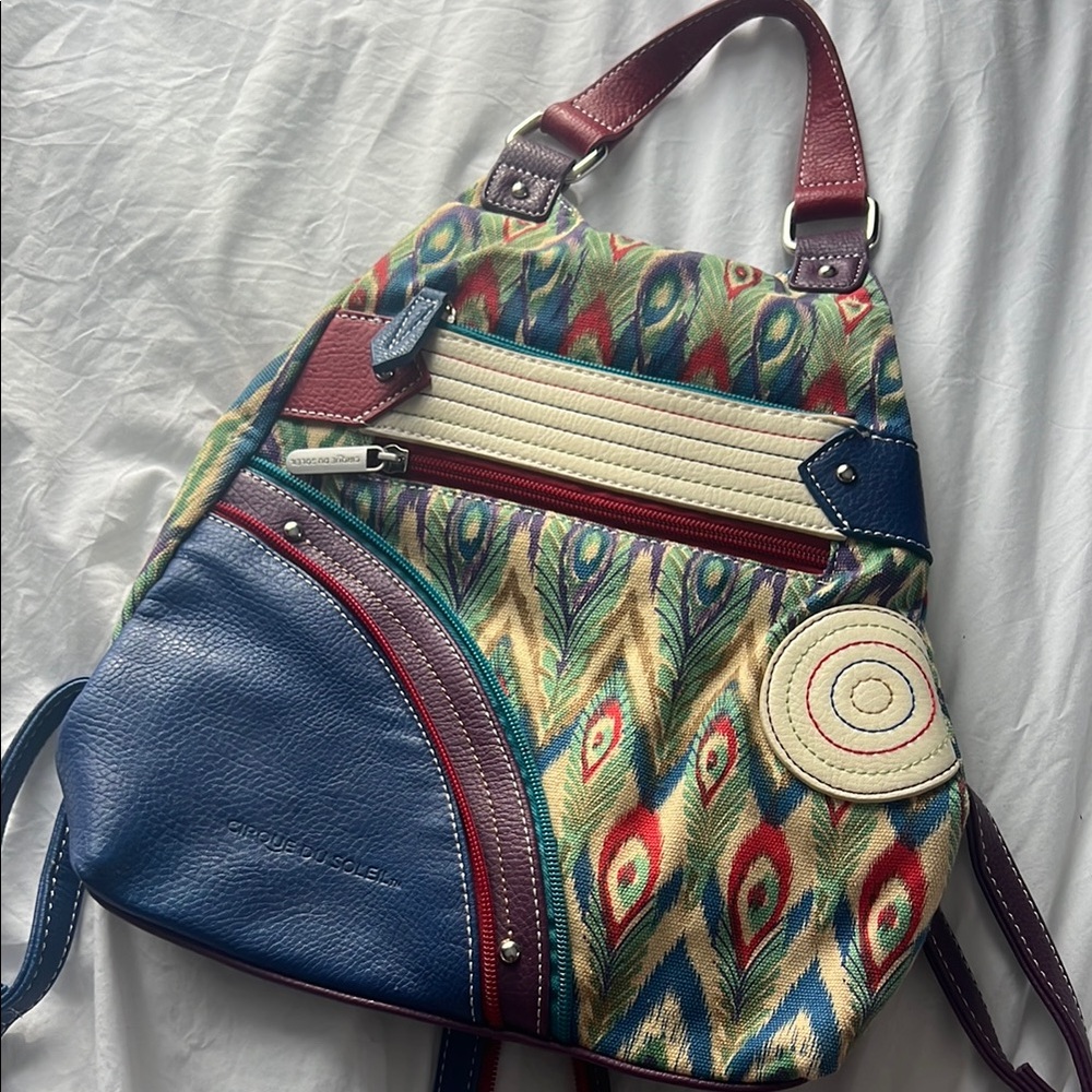 Vibrant Desigual backpack with peacock feather design. Features multiple deep pockets and adjustable straps. Such a cool find and super unique and colorful.