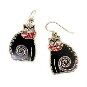 Rare Laurel Burch "Mythical Cats" earrings in black on the original black card. These are new old stock of her classic whimsical cat jewelry, signed on back. The size of each earring is approx. 1" x 3/4". Minor color changes on the back due to air oxidation over time.