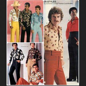 Very cool disco shirt from Nik Nik, a popular brand of men's and women's disco shirts in the 1970s. This shirt features a rare print with abstract woman's face in the cubist style of Picasso or Léger, with the number 1 and various patterns: stripes, checkerboard, chevron, and bullseye. Print is in shades of brown, orange, green, yellow, and pink against a cream/ivory/off white background.