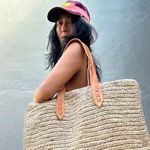 Rare One of a Kind, Brand New, Hi-end, Unique, and Beautiful This hand-woven twined Beach bag has been made with 100% natural raffia. Use the twined raffia handle for this item.