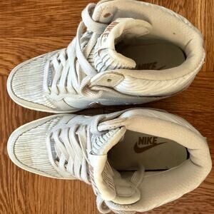 Women's Nike Dunk High Sky Hi Sneaker in Light Bone Metallic Red Bronze size 5.5. In excellent preowned condition. Photos are of actual shoes.