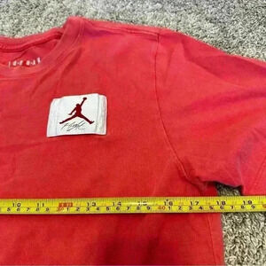 This Nike Jordan Air Essentials tee with Michael Jordan’s signature on back left shoulder is perfect for your teen or you! It is a light red, thicker 100% cotton shirt with the logo on the chest. Non smoking home. Excellent used condition. No stains or holes.