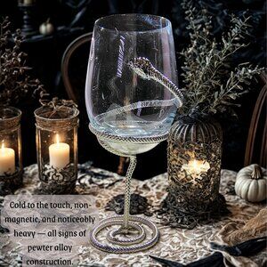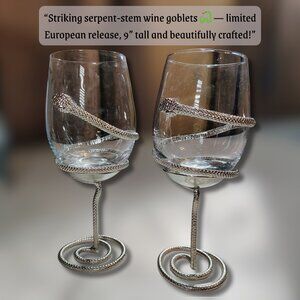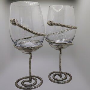 Set of 2 dramatic snake-stem wine goblets, 9 inches tall, featuring hand-blown glass bowls that throw mesmerizing rings of light when illuminated. Each stem is coiled in a detailed serpent design that’s cold to the touch, non-magnetic, and noticeably heavy — all signs of pewter alloy construction.