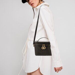 Rare! CELINE Triomphe Leather Macadam Vanity Bucket Dark Brown/Black Color