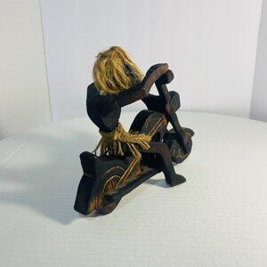 This unique wooden carving and jute tribal sculpture depicts a rare primitive figure riding a motorcycle, handmade in Indonesia with dimensions of 8 1/2" L x 7" H x 3" W.
