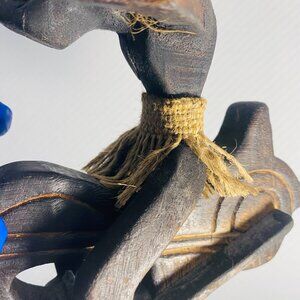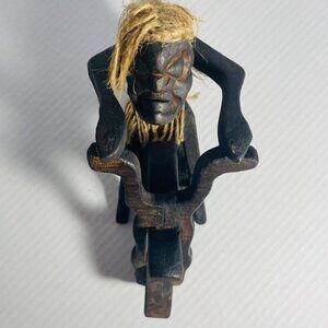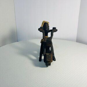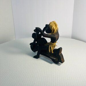 Estate Sale Rare Primitive Java Man on Motorcycle Wooden Carving and Jute Tribal Sculpture