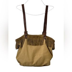 Rare Denim & Supply Ralph Lauren tote bag Ralph Lauren W/ Leather Patch. Bag was Made in Hong Kong And are Rare to Find. Has a BoHo Chic Vibe. Metal Tags located on The Side Suede Fringe With Leather Straps Adjustable, Canvas Bag with Snaps to close up the Bag. Inside Has a Zipper Pouch see pic. From what I found this Bag is in Great Condition and Retail around $1,300.00 for one I found and it wasn’t as Nice as this one. Truly a Vintage and a Collectable Ralph Lauren piece to have. The Bag has two patches one Outside a Polo Ralph Lauren leather Patch that was added and a polo patch fabric patch locates inside the bag.