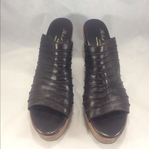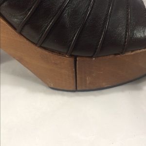 These are pretty rare Robert Clergerie platform mule slip on brown leather shoes with wood bottoms. The upper is brown leather. The sole has a rubber layer atop the wood. * there are multiple small chips out of the wood. Other than the chips from the wood these shoes are in great shape! Us size 9 B