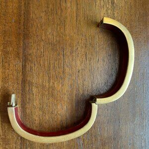 Rare Vintage Cloisonne Bangle Bracelet This bracelet has an unusual rounded rectangular shape with a gold-tone frame and a secure push-down interior clasp — much less common than standard round cloisonné bangles.Beautiful and unique shape with gold-tone edging. Features a floral cloisonne design in rich red enamel.