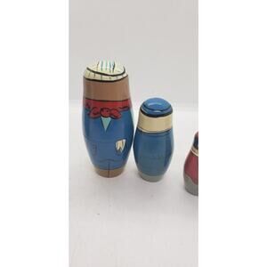 This is a set of hand painted wooden Is russian nesting dolls. They seem to be some type of tradesmen or business men. A couple of them are handsigned in pencil on the inside. See photos for condition and size