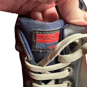 Salvatore Ferragamo black leather with navy interior sneakers women’s size 8. There is no size anywhere that I can find but they fit a size 8. Please see measurements to be sure. GUC with normal wear. Naruto Challenge light…fabulous sneakers!
