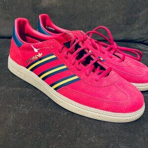 Rare sample pair of Adidas Handball Spezial sneakers in Red Blue Yellow colors. This men's shoe in size 9 US (8.5 UK, 42 2/3 EU) features a lace-up closure, rubber outsole, and synthetic upper material. With a low-top shoe shaft style and standard shoe width, this athletic shoe is customized with a solid pattern and red-white-blue character. It offers cushioning, non-slip design, comfort, performance, and breathability, making it suitable for various activities such as gym training, walking, soccer, and netball. This unique sneaker was manufactured in 2025 in Vietnam as part of the adidas Handball product line.