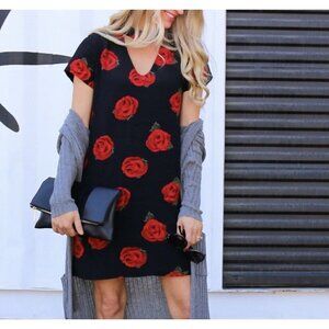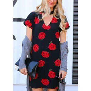 Rare Sanctuary Sz S Rose Print Choker V Neck Shift Dress Black Red Mini Floral
