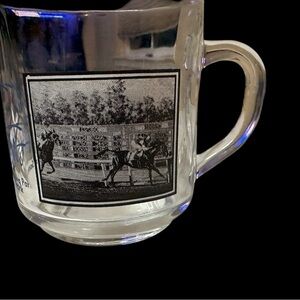 Great Moments in Horse Racing Santa Anita Park.  Clear glass mug featuring a classic print. Perfect for Horse Racing enthusiasts.