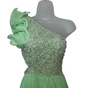 Keywords: seafoam green maxi dress, gem embellished bodice, one shoulder formal dress, ruffle open back gown, rare sample occasion dress