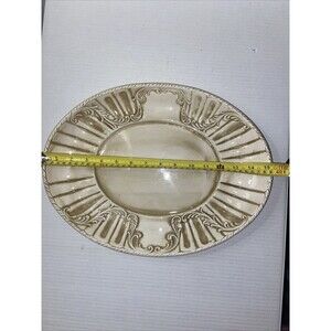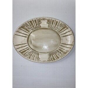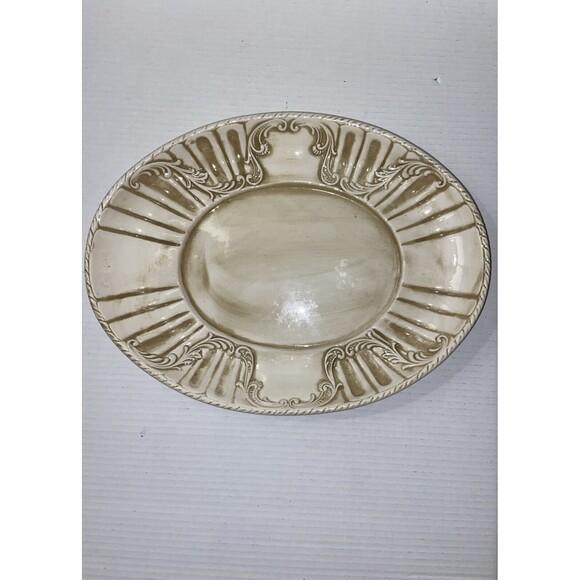 Beautiful Oval serving dish is cream colored with brown baroque decoration. Measures 15x12. Dish is in excellent condition. No chips or cracks. It has a few imperfections due to the nature of its handcrafted design.