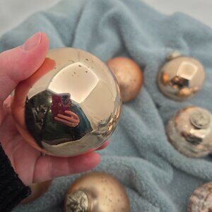 About this item: Crafted with thick, heavy glass, mimicking the sought-after German originals from the Victorian era | 4 super heavy, crackle rose gold glass balls & 3 Antique Copper hue ones, & 3 almost matte like rose gold finish. Perfect for a Traditional, Victorian, or Grandmillennial style tree, or simply grouped in a crystal bowl as a striking centerpiece. These are not factory-perfect new ornaments, but pieces with authentic, vintage vibes!