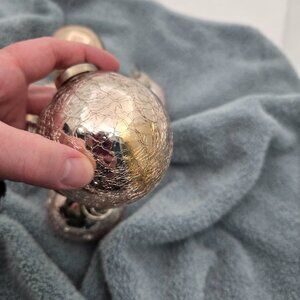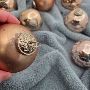 • Condition: Excellent Vintage Pre-owned condition. Please review all photos carefully. The beauty of these Kugel-Style mercury glass ornaments lies in their charming imperfection, which confirms their unique, vintage character. Patina & Color: Variations in the reflective rose gold/copper finish are intentional or naturally acquired. Expect to see areas of oxidation, foxing, or darkening of the interior silvering, which gives them the authentic, desirable antique look collectors prize. Texture: The hand-blown crackle technique varies across the set. Some ornaments will feature deep cracking, while others may be smoother, confirming that no two pieces are exactly alike.