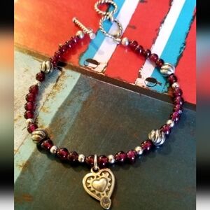 B1488 Sterling Silver and Garnet Bracelet with an engraved Sterling Silver Heart Charm and Toggle Clasp. Fits up to 7" wrist.