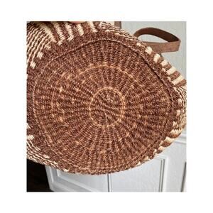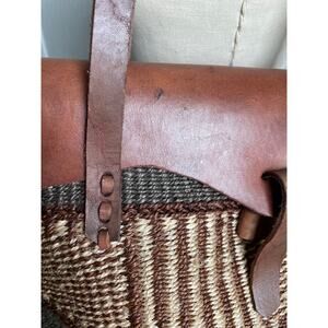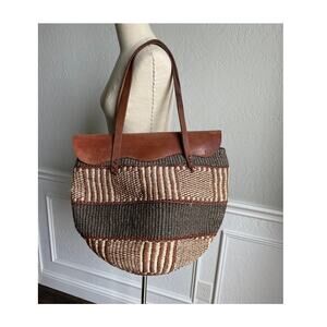 Rare Sisal Woven Striped Tote Bag with Leather Flap Double Handles