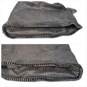 Stella McCartney large Falabella hobo / tote bag, crafted out of unique Boucle woven fabric with metallic threading. Characteristic of Stella McCartney, this metallic and shimmery design has edgy, yet feminine and contemporary vibes. Silver crosslink chain shoulder strap continues as trim along the bag. Inner fabric lining with suede-like feel. Inner zip pocket, top snap closure. Has detachable faux suede grey pouch with zipper top and chain clip attachment. Stella McCartney charm on outside and inner zipper pull. This is a rare colorway and weave, a unique find, especially in this condition!