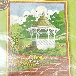 This vintage 1980 needlepoint kit features a charming gazebo scene with vibrant florals. This is a new sealed kit. There was a hole in one lower side that was taped closed. The design is printed on 15" x 18" canvas.
