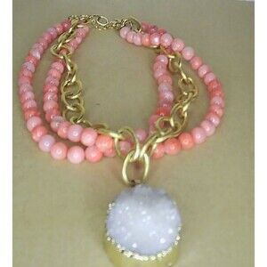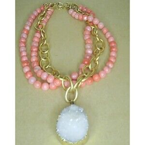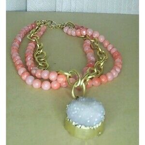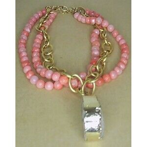 Rare Susan Shaw Necklace Quartz, Pink Coral Beads Triple 24K Gold Plated Brass