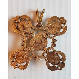 Antique gold tone pendant (no chain) by Swarovski. The pendant is in the shape of a maltese cross with imitation pearl and tpaz toned cabs. The pendant is large and measures 3"×3". It is hallmarked by the SAL logo. This piece is in excellent condition and hard to find!