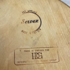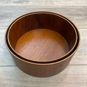 Rare set of two Mid Century Modern thin wall teak veneer serving snack Bowls by International designers Group IDG Sweden. Authentic MCM kitchen accent with clean straight lines and timeless elegance. Bentwood sides. Two bowls, one just a tad smaller than the other. Excellent condition, overall look unused.
