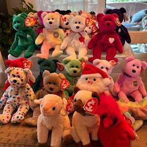 All Beanies have original tags. Both tush and swing tags. (Some have tag protectors) all tags are intact not torn or wrinkled. Tush tags are also intact. All beanies are from 1997 and forward. They have been in storage for years. I am the original owner. What makes them so rare are the misspelled tags, incorrect punctuation etc. Included in the 25 are The Princess Beanie(original from 1997 with P.E. Pellets. This is what your buying:2 1999 Signature Bears, The End Bear 1999, Ty 2K Bear 2000, 1999 Holiday Teddy, Shamrock 2000, Millenium Bear1999, Glory 1997, 2000 Holiday Bear, Erin 1997, Birthday Bear 1999, Valentina 1998, Valentino 1994, Spangle 1999, Kicks 1998, Wallace 1999 Eggs 2000, Princess Di 1997, Osito 1999, Smooch 2000, Sammy 1998. Santa 1998, Ewey, 1998, Siam 2000, Mac 1998. If you look individual value on some of these Beanies you will see they are quite valuable. Have held on to them too long letting them go…