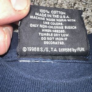 The product is a vintage 1998 Dragon Ball Z Fighters T-Shirt featuring characters such as Goku, Vegeta, and Piccolo in their Super Saiyan forms. Made in the USA with a crew neckline and short sleeves, this blue shirt is made of cotton jersey fabric. The shirt is part of the Dragon Ball Z USA product line and is double-sided with a graphic print showcasing characters from the anime and manga series. With a regular fit and a size M, this T-shirt is a rare find for fans of martial arts, anime, and 90s pop culture.
