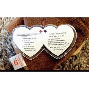 This listing is for retired vintage Hoot the Owl Beanie Baby plush from 1995. It has PVC pellets & hang tag- Farnham, Hants beanie with Deutschland/Nurnberg.
