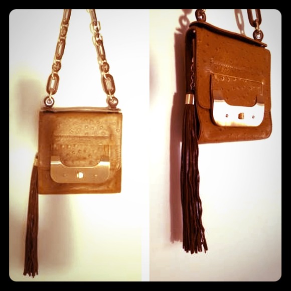 selling this rare Tan Ostrich DVF (Diane von Fürstenberg) bag. It is 100% authentic, the brand name is on all parts of the hardware and engraved on the inside. in great condition, only been worn once or twice. It has two straps a long and a handle strap and the long one can be removed.