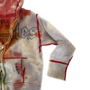 Ultra rare, vintage The Great China Wall kids hoodie. Size is 4T (in the photos my son is 4 1/2 and 5 1/2 and average height & slender). Tie-dye style with paint splatters throughout. VERY distressed (it came that way). The style is distressed, especially around the zipper & banding. Zipper works great. Contrast red stitching. Los Angeles writing at the front and classic muscle car at the back. Slightly on the thicker side the fabric is a vintage style sweatshirt a little more stiff than newer hoodies. There is some discoloration / dirt around the sleeve but not bad at all. Still a lot of life left in this. This was handmade so it's one of a kind. Hand dyed and distressed. Made in USA. Retailed for around $349. Always line dried and well taken care of (we are the 1st owners of this vintage hoodie - I believe it's from 2005 or so). Smoke free and pet free home.