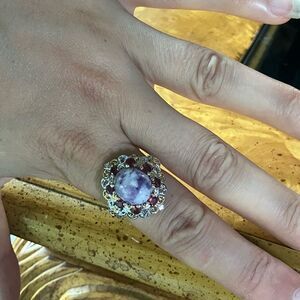 If you are looking for a rare gemstone to add to your collection, this ring may be perfect. The centerpiece is a genuine, earth mined Tiffany stone. This stone is very rare. It is found only in Utah at the Brush-Wellman location. The stone is a blend of fluorite, opal, and other gemstones. It has a beautiful purple/white color. The stone in this ring measures 12x10mm and is a total carat weight of 4.85. The ring additionally has completely natural, earth mined Mozambique garnet accents. The ring is set in solid .925 sterling silver with a platinum finish. The ring additionally has 14k yellow gold accents for added beauty. The ring in the photos is the actual one you will receive, so please see photos for quality and measurements. Size 8.