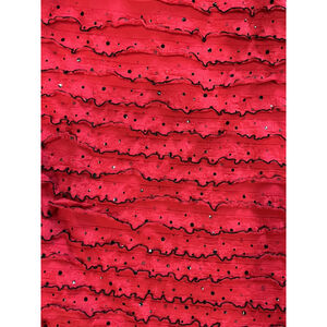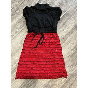 Steal the spotlight in this Rare Too dress, a captivating blend of elegance and playful charm. The dress features a black bodice with a ruffled high neckline and short sleeves, leading to a vibrant red skirt adorned with tiered ruffles and subtle sparkles. A black drawstring cinches the waist, adding definition to the silhouette. This dress is perfect for holiday parties, school dances, or any special occasion where a touch of glamour is desired.