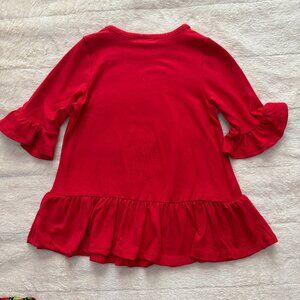 Adorable Christmas outfit that includes a red long sleeves with ruffle cuffs, round neck and a Christmas tree print in the front. Flared striped pants with an elastic waistband and chevron design in red, white and green colors. Festive, fun and bright for your little one. Size 24 Months.