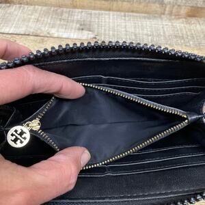 Tory Burch Quilted Nylon Continental Wallet. Looks like it's from the Alice line? Very rare style! Black nylon. Zip around. 12 credit card slots. Zip coin pocket in the middle. Black zipper with a light gold zipper pull. Excellent condition.
